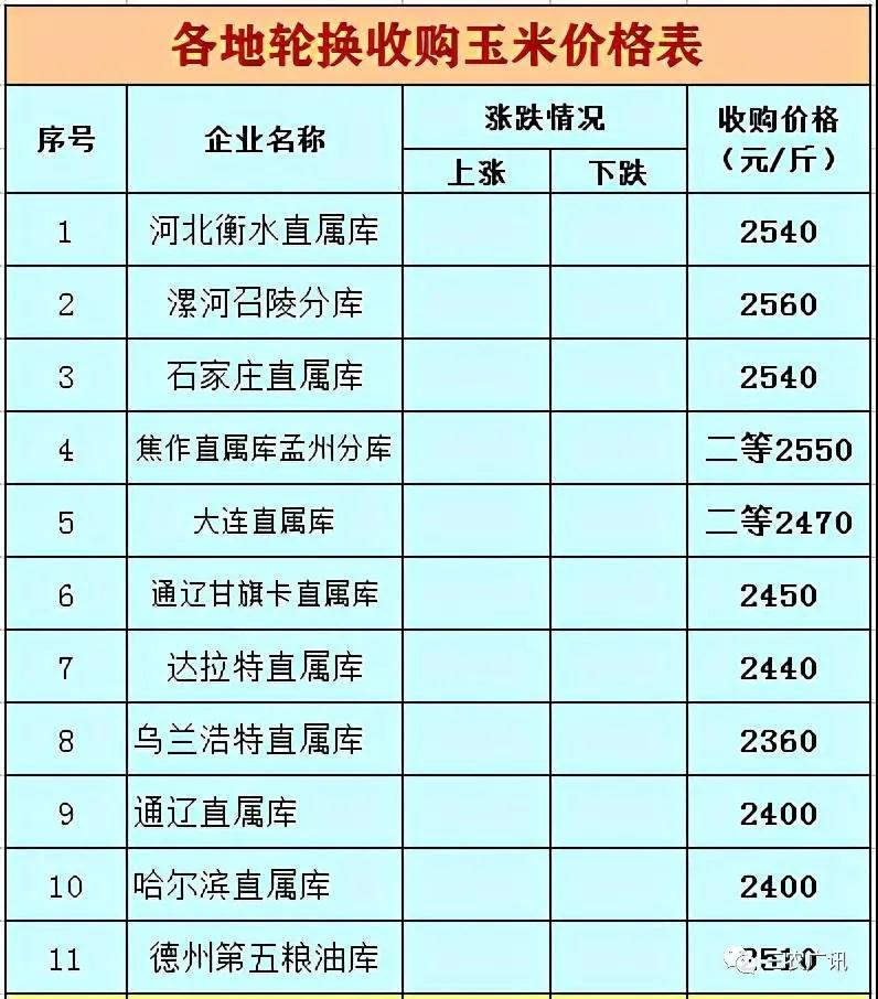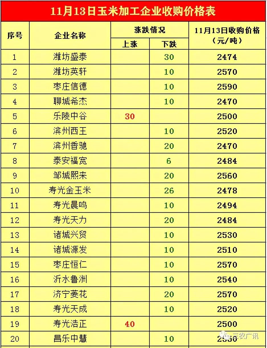 各玉米客戶你們好:自2020年11月13日早7點30分起魯洲山東公司玉米價格調(diào)整如下:1、自然干,烘干玉米18水分以下(含18),執(zhí)行價格1.27元斤,價格不動。2、自然干,烘干玉米18水分以上,執(zhí)行價格1.255元斤,下調(diào)5厘錢/斤。3、自然干、烘干玉米按以上水分要求10噸以下統(tǒng)一低1分錢/斤。4、自然干、烘干玉米標準折扣要求不變。5、玉米嚴禁出現(xiàn)混裝,如出現(xiàn)混裝,除處罰外,按高水分玉米價格結(jié)算。